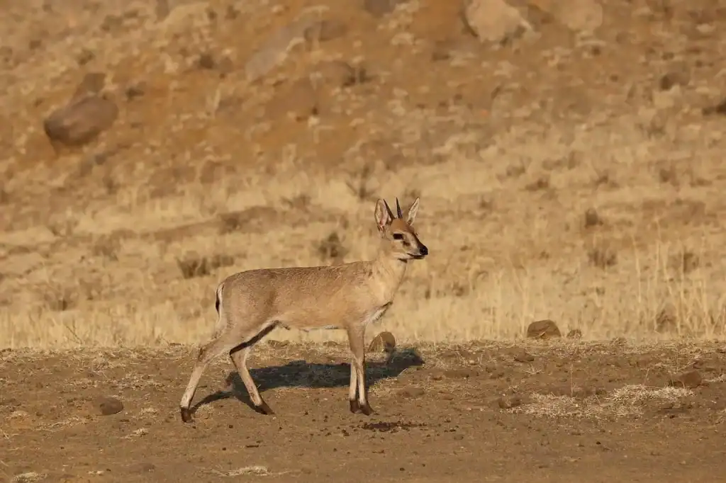 Es tímido y solitario, prefiriendo moverse entre la vegetación densa para evitar depredadores como leopardos y hienas.
