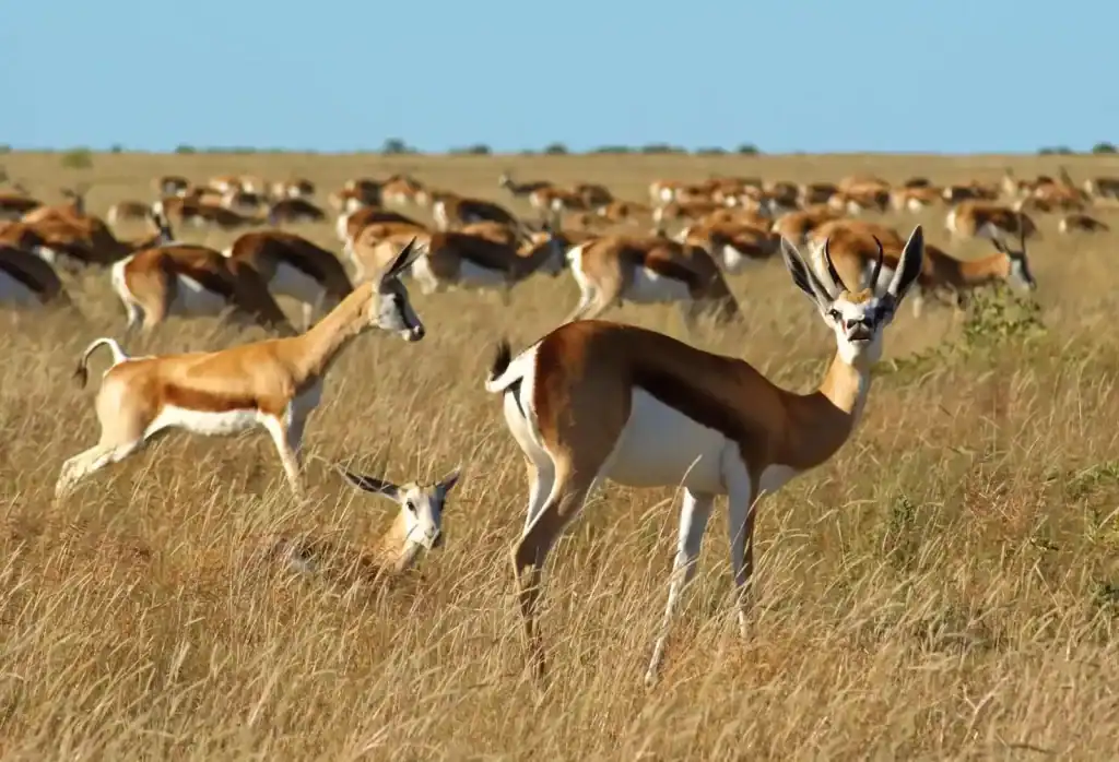 Las gacelas saltarinas tienen un periodo de gestación de 6 meses y suelen dar a luz a una sola cría. Son animales sociales que viven en grandes manadas, migrando en busca de mejores pastos. Su comportamiento de «pronking» no solo confunde a los depredadores, sino que también es una forma de comunicación con otros miembros del grupo.