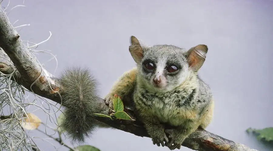 Es un primate nocturno y arborícola, que se mueve ágilmente entre los árboles gracias a sus poderosas patas traseras y su larga cola.